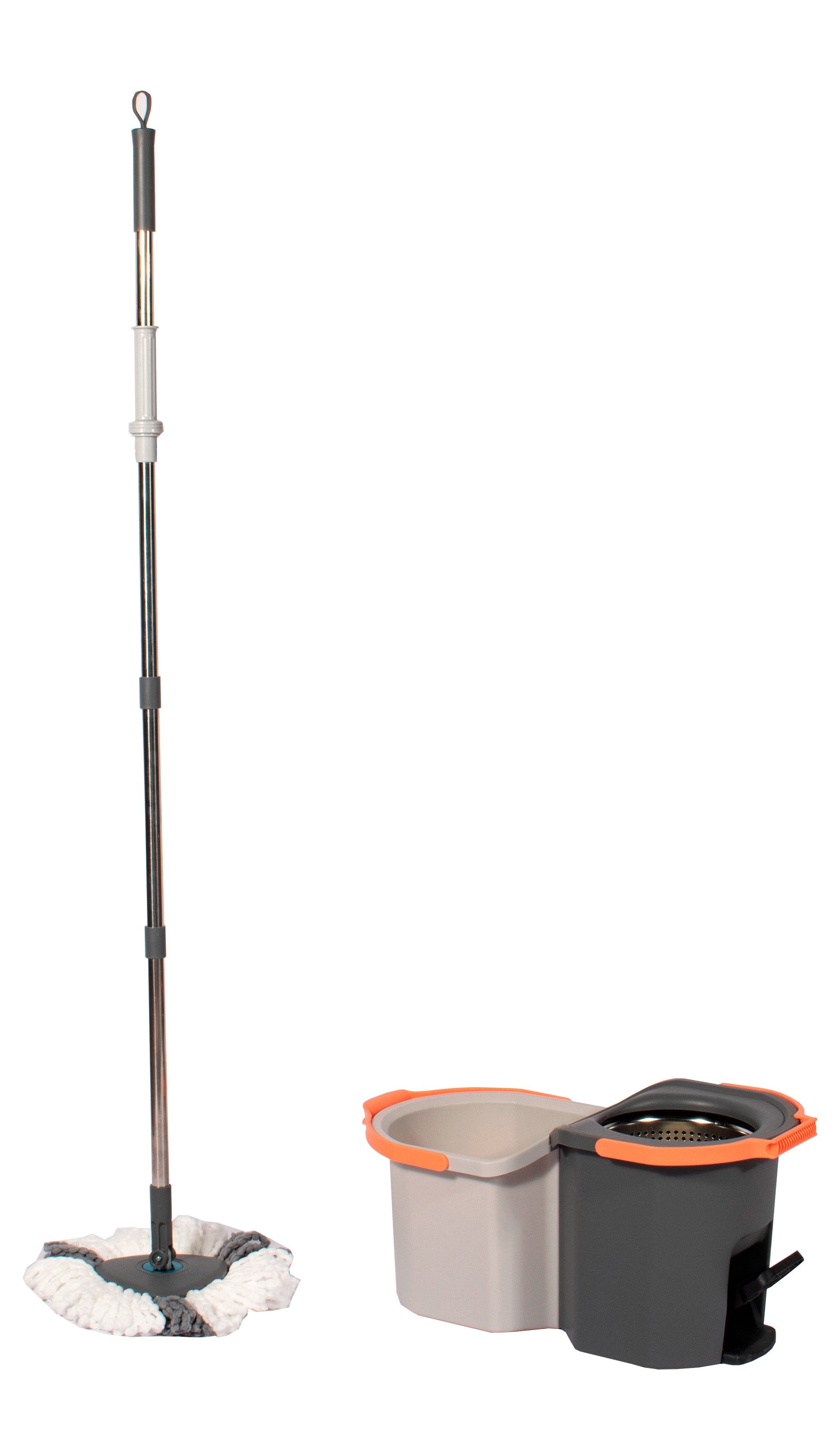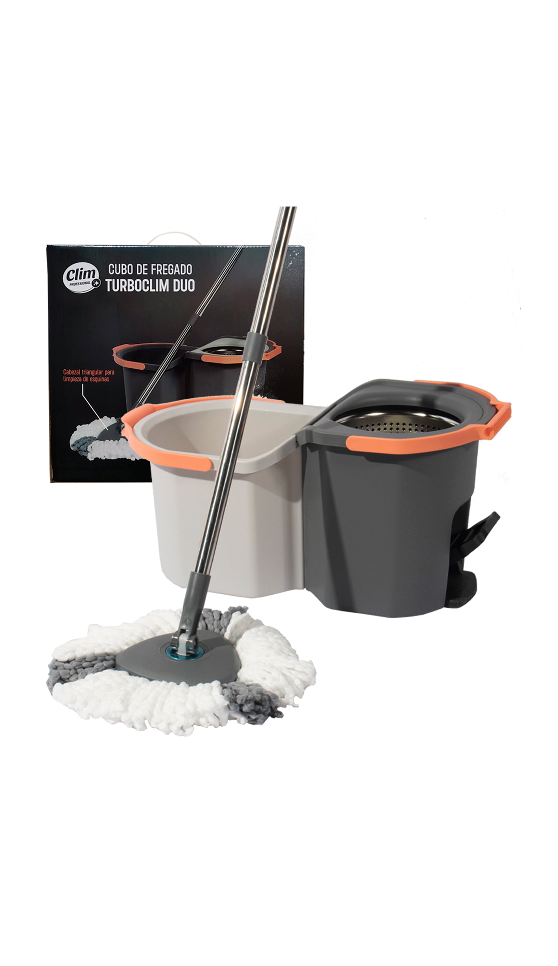 TurboClim Duo es el cubo de fregona que necesitas para una limpieza profunda y sin complicaciones. Diseñado con estructura robusta de Acero Inoxidable, incorpora un sistema de escurrido giratorio ultra eficiente que reduce la humedad de la mopa sin mojarte las manos ni salpicar el entorno.